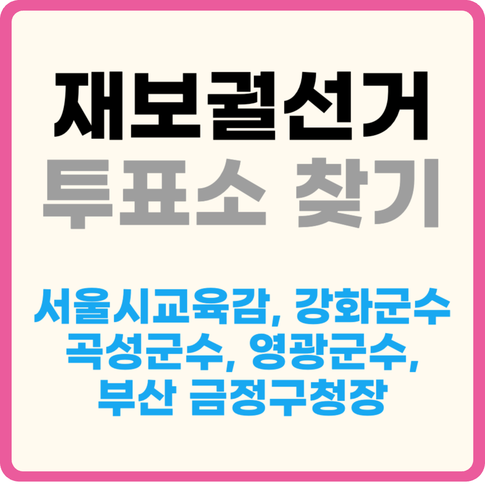 2024 재보궐선거가 2024.10.16(수)에 진행됩니다. 서울특별시교육감, 부산 금정구청장, 인천 강화군수, 전남 영광군수, 곡성군수 선거를 진행하며, 투표소 정보가 궁금하시다면 해당되는 지역을 확인해주시기 바랍니다.